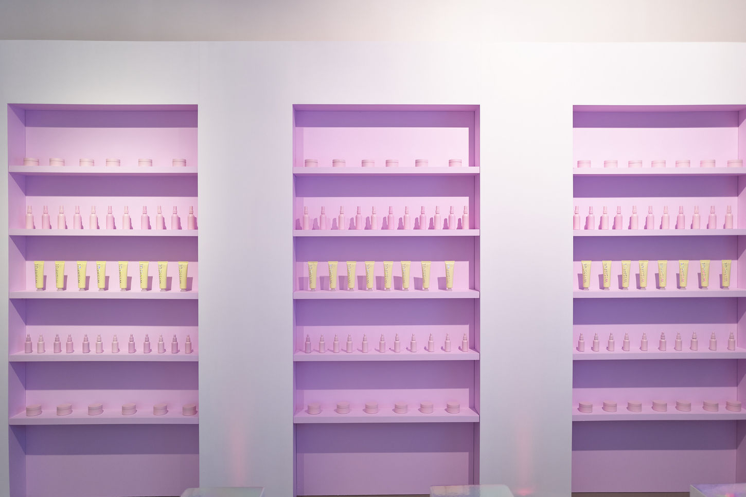 Lancement de marque de la fameuse influenceuse Huda Katan. C'est dans un showroom parisien qu'a été installé plusieurs espaces présentant l'univers de sa marque "Wishfulskin". Le temps d'une journée, trois espaces monochromes majeurs ont été aménagés. Des décors aux lignes minimalistes et aux couleurs sucrées qui offrent un parcours unique et captivant.
